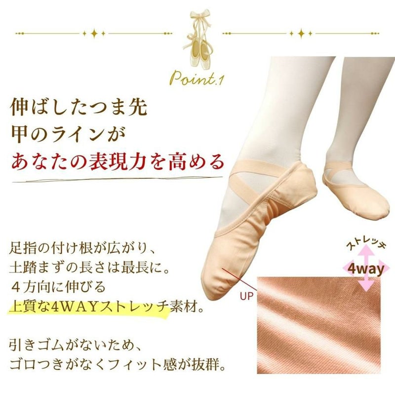 バツグンのストレッチで、爪が伸び・甲が出る。 足を美しく魅せるバレエシューズ。