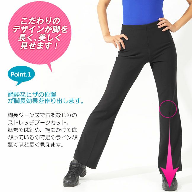 パンツは人気のブーツカット。美しいシルエットで美脚&脚長効果バツグンのパンツです。