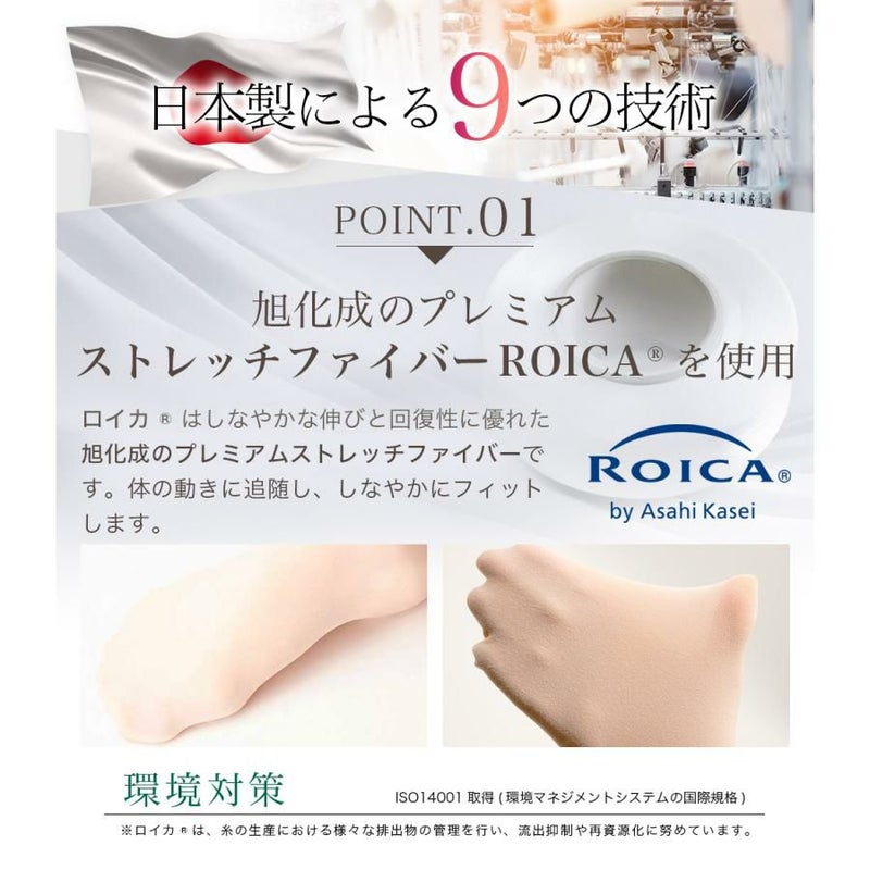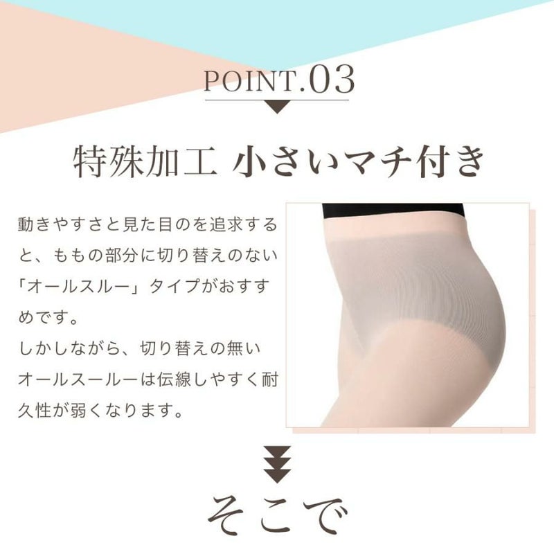 A: プロのダンサーも愛用する、適度な厚みの生地(ライクラ配合)を採用しています。肌が透けすぎず、脚のラインをマットに美しく見せる質感です。また、ウエスト部分は食い込みにくい幅広のソフトゴム仕様になっています。