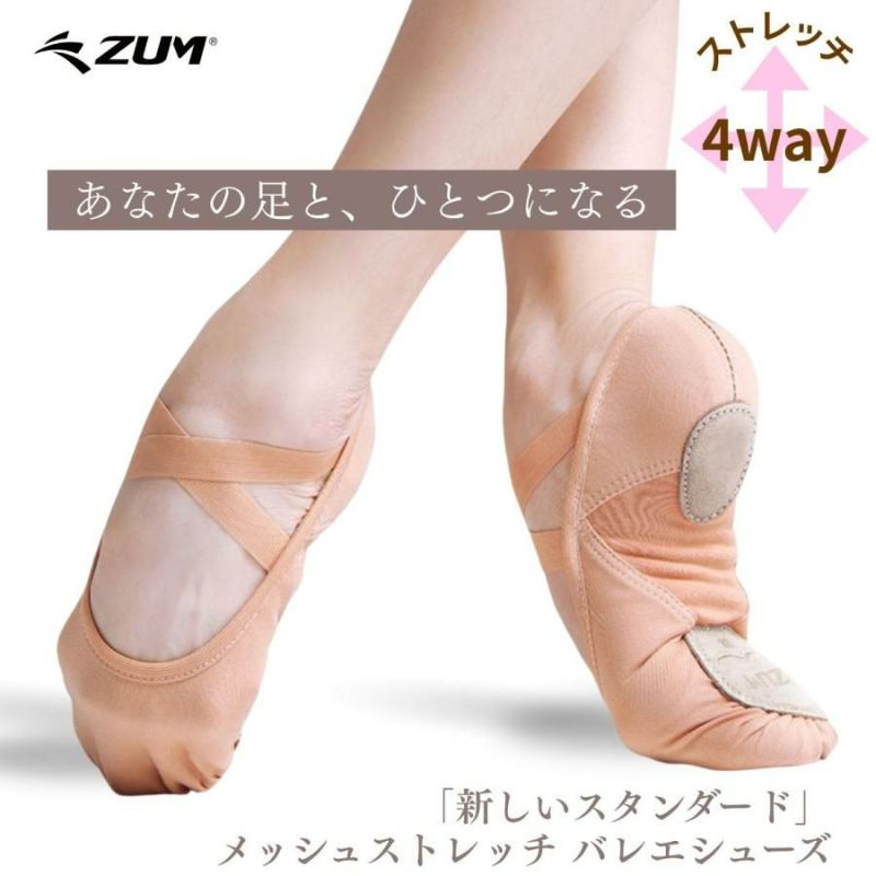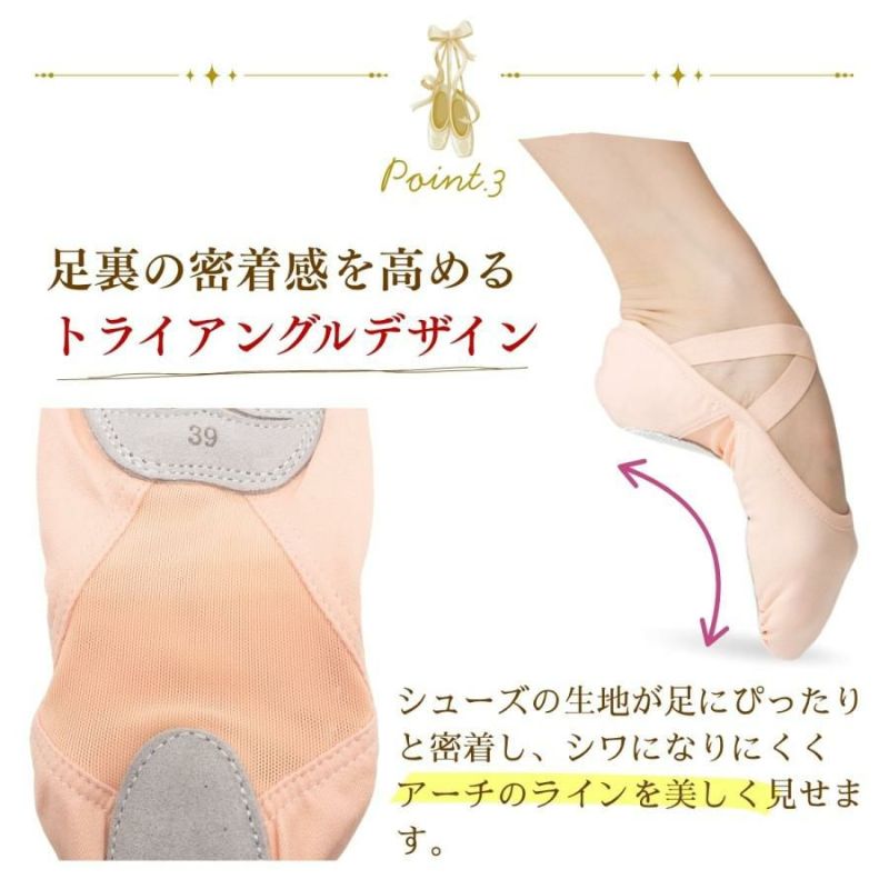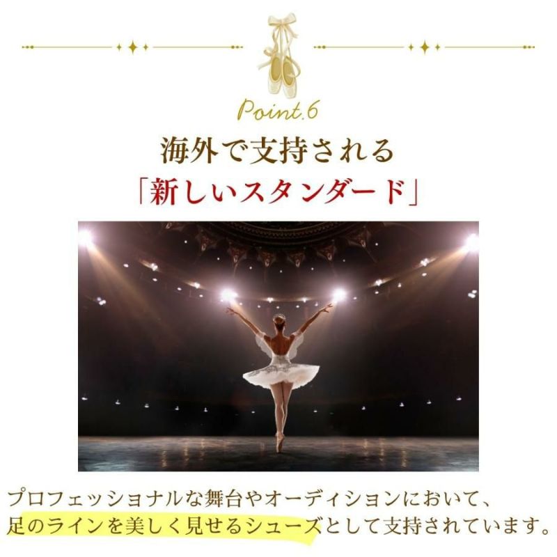 バツグンのストレッチで、爪が伸び・甲が出る。 足を美しく魅せるバレエシューズ。