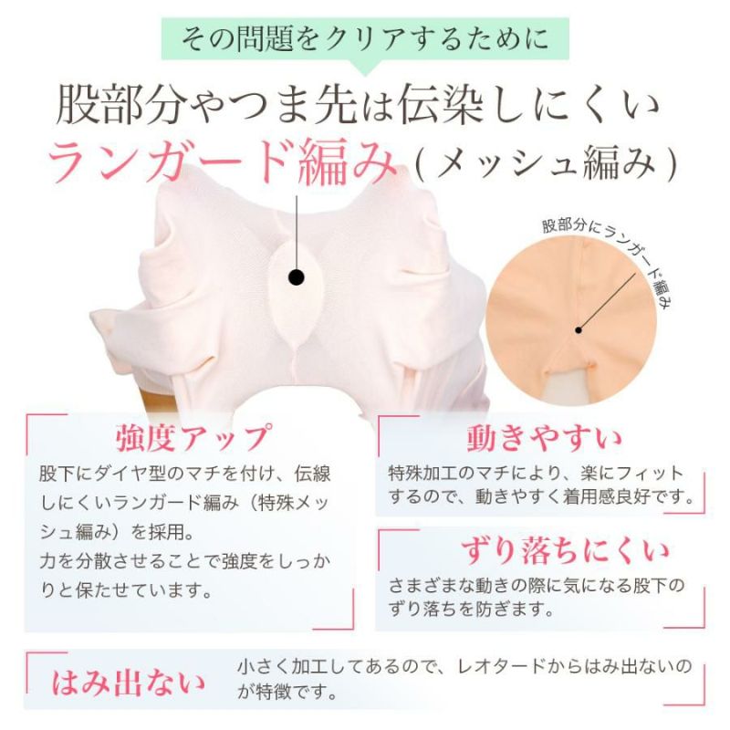 特殊加工の小さいマチにより、強度と動きやすさを向上させています。また、ずり落ちにくく、マチが小さいのでレオタードからはみ出ないのが特徴です。