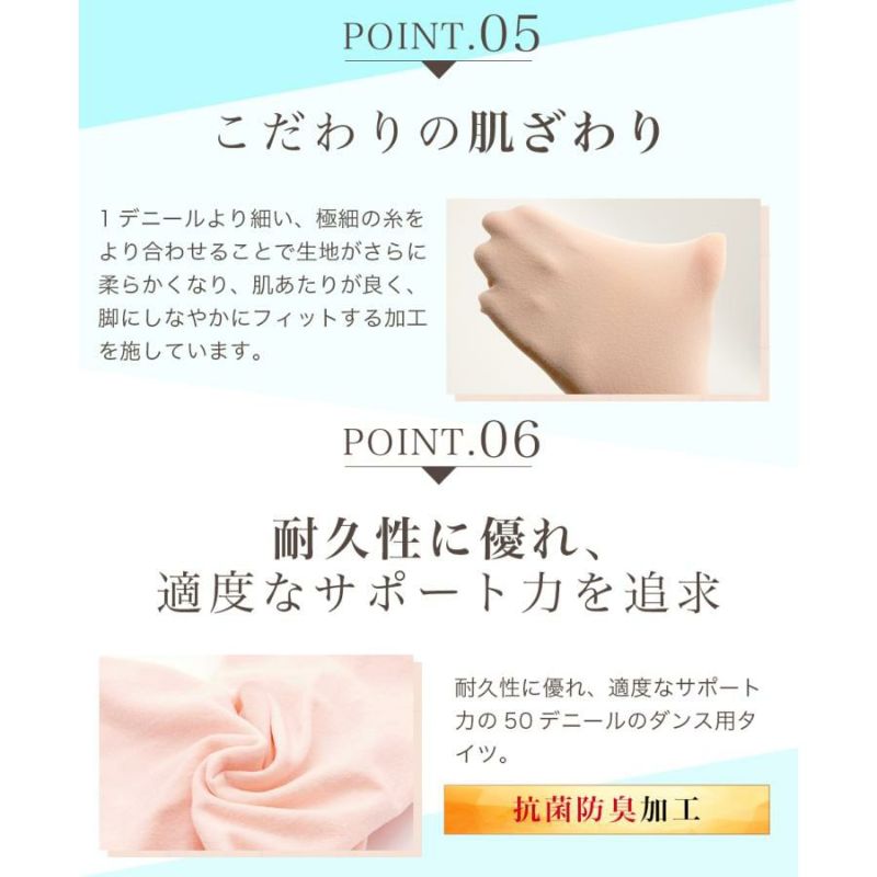 つま先部分は、ダンサーにはうれしい、足指が動かしやすく、ピッタリフィットする立体成型を施しています。つっぱりやたるみも軽減されたストレスフリーな着用感です。