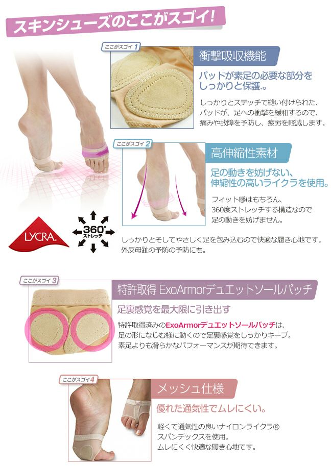 • モダン・ジャズ・コンテンポラリー・リリカル・バレエ・ヨガ・フラダンスなど素足でのダンスやアクロバット用に最適。