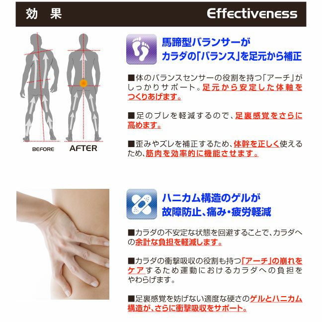 体のバランスセンサーの役割を持つ「アーチ」をがしっかりサポート。足元から安定した体軸をつくりあげます。
