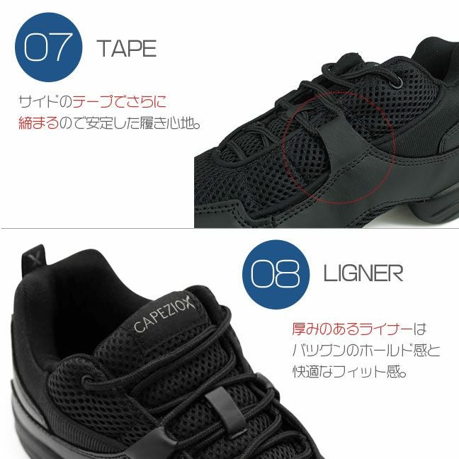 ダンススニーカーならではの、爪先立ちしやすいスクエアトゥ。