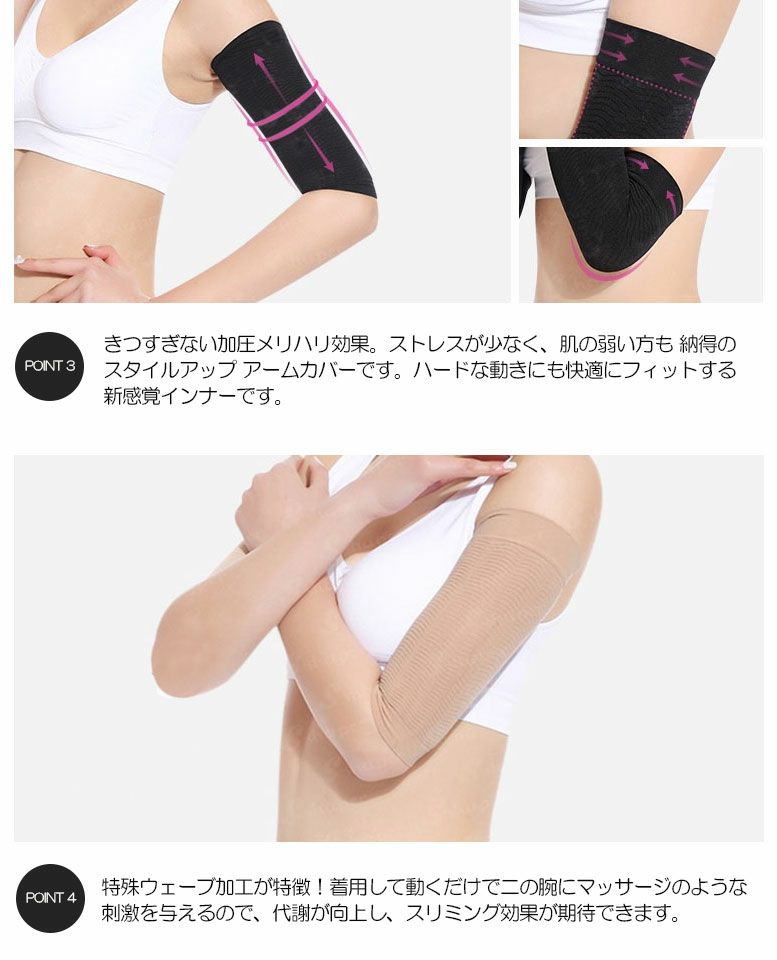 特殊ウェーブ加工が特徴!着用して動くだけで二の腕にマッサージのような刺激を与えるので代謝を向上させるので、スリミング効果が期待できます。