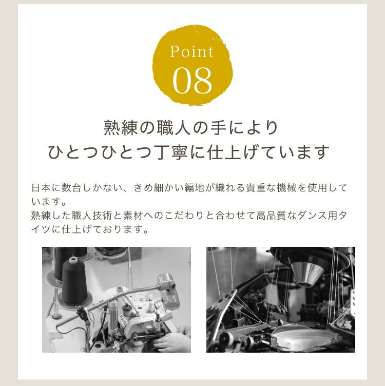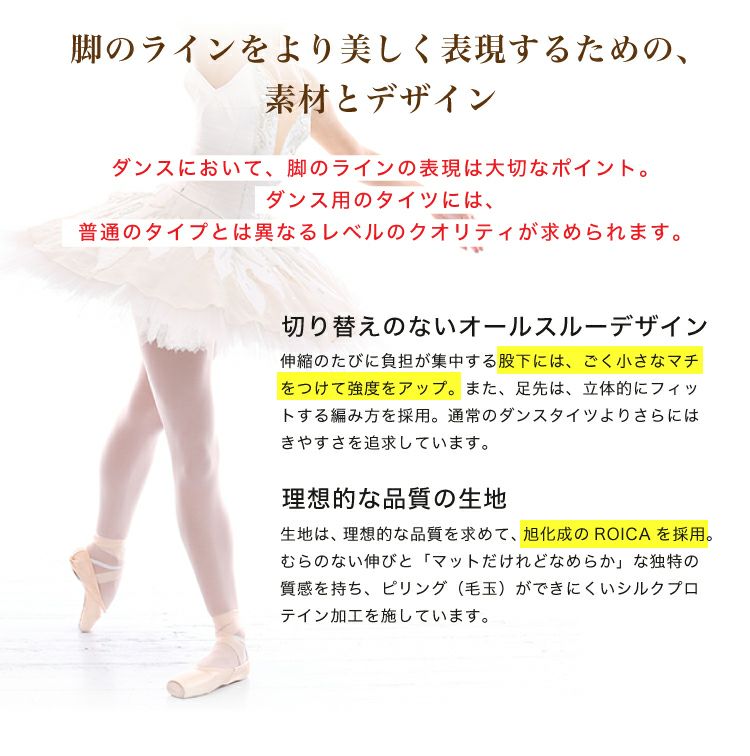 特殊加工の小さいマチにより、強度と動きやすさを向上させています。また、ずり落ちにくく、マチが小さいのでレオタードからはみ出ないのが特徴です。
