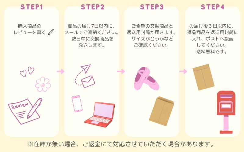 - お客様は色やサイズが合わない商品を、同梱した返信用封筒に入れて、郵便ポストに投函するだけです。(お受け取り後、3日以内にご投函ください)